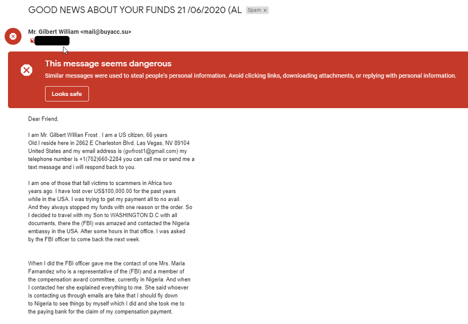 I already knew this was a phishing email as in the subject line it said, “GOOD NEWS ABOUT YOUR FUNDS 21 /06/2020”.